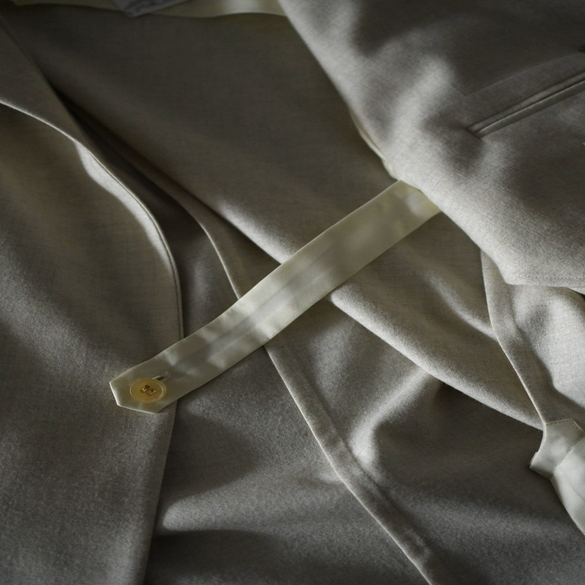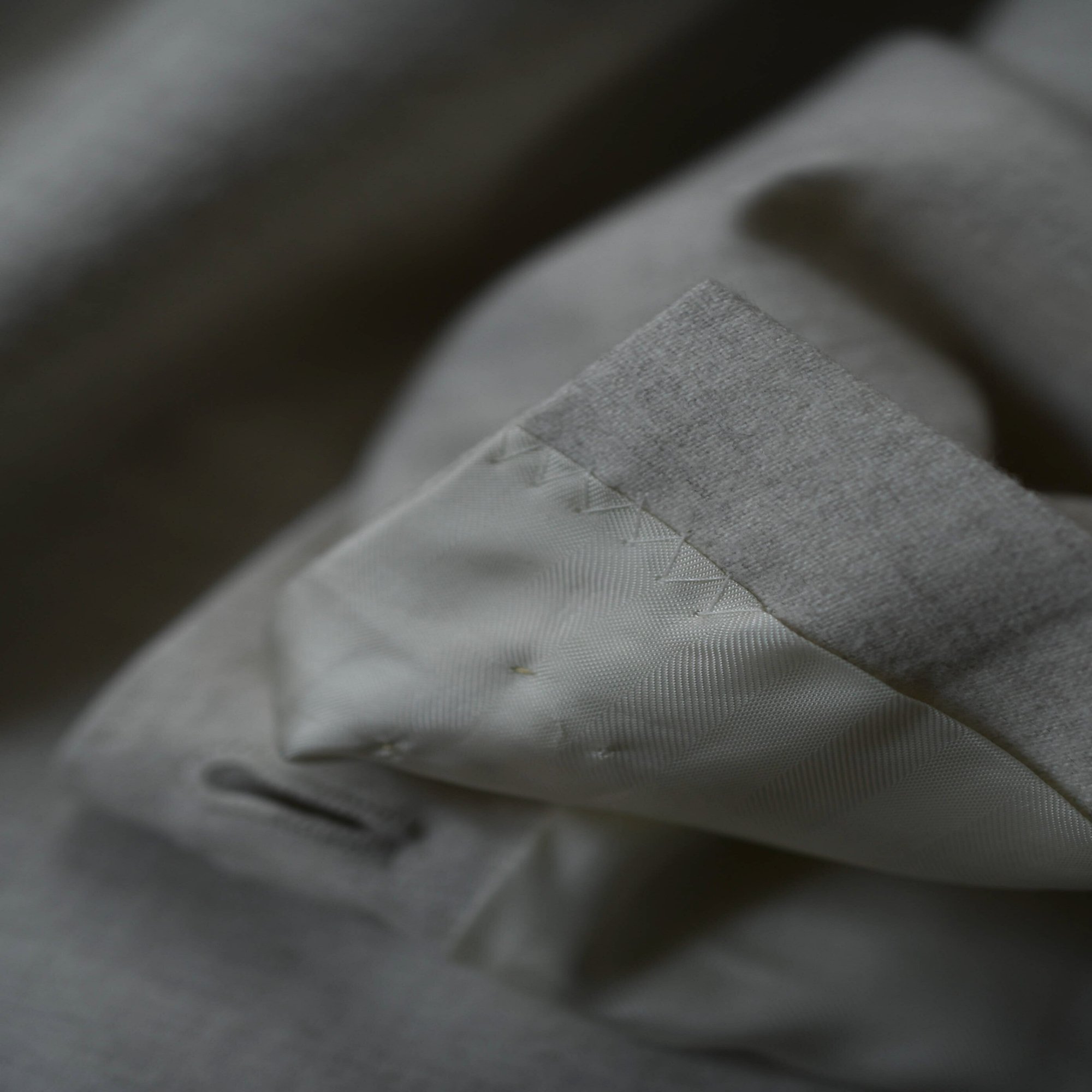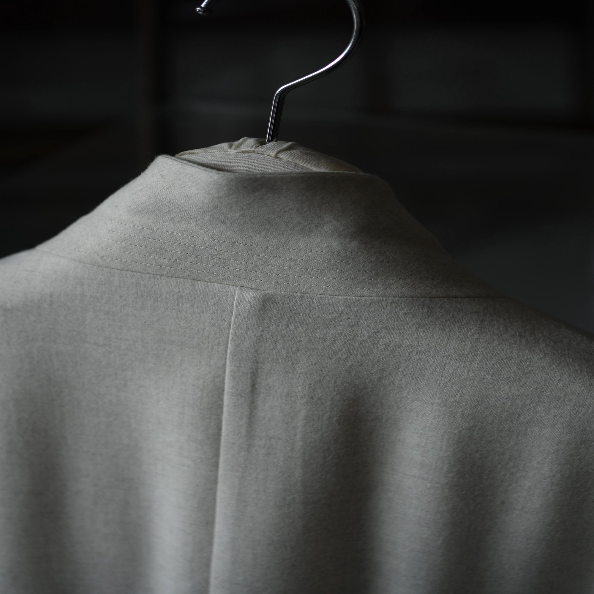 そんな確固たる拘りが注がれている中、このジャケットに用いられているウールとブルーフォックス混合の生地は、反自体が極小量で数着しか生産が出来無いという“リミテッドモデル”に該当する。やはりその分、生地のポテンシャルは本当に素晴らしく、タッチ感は非常に滑らかで、限りなくカシミアに近い。そして異なる無垢の糸が混合している為に薄らと奥行きがあり優しい表情を醸し出している。この温い質感とカラーパレットが根本として存在しているからこそ、本来は苦手に思えてしまう空気感が急に落ち着いて見え、モダンな『着れる』1着に一変されているのだと思う。