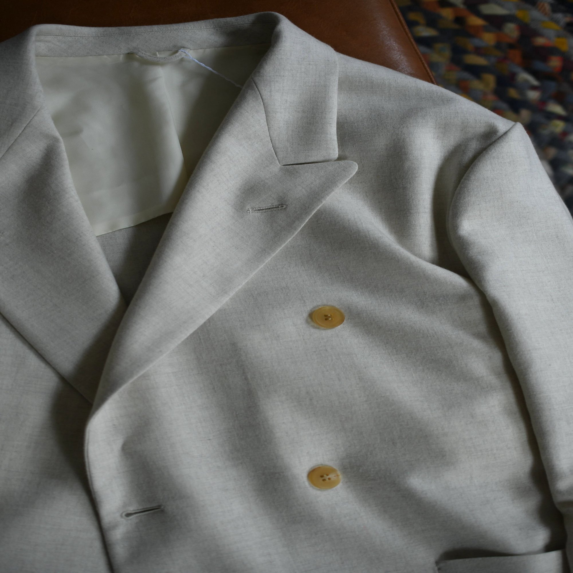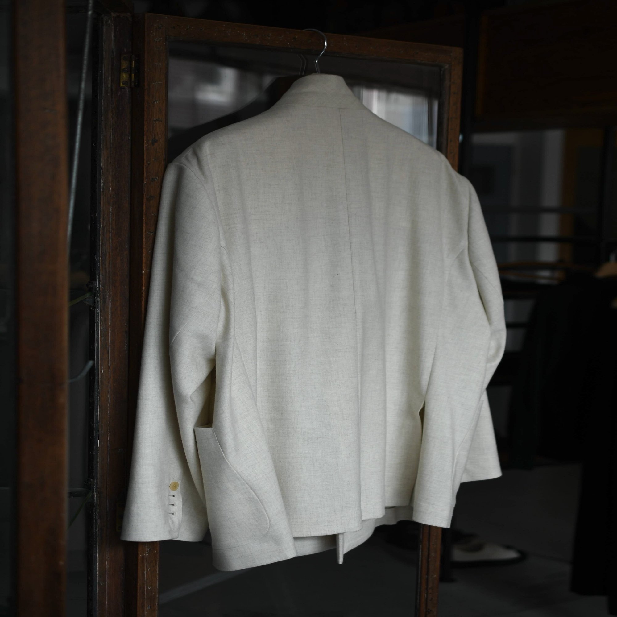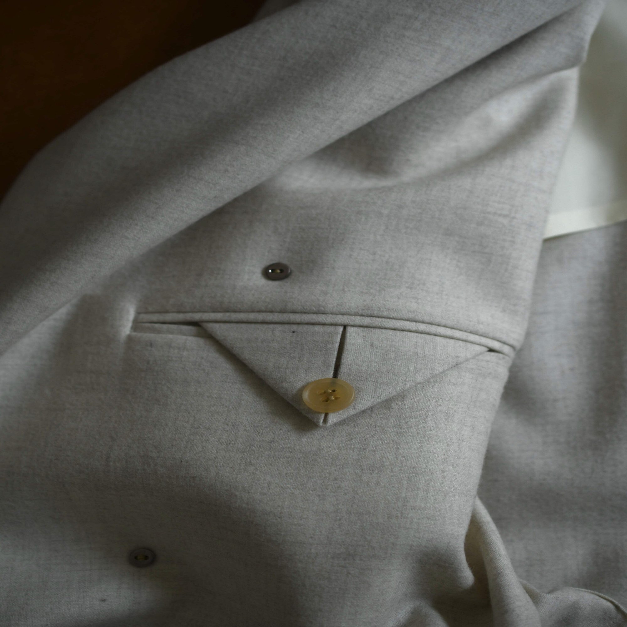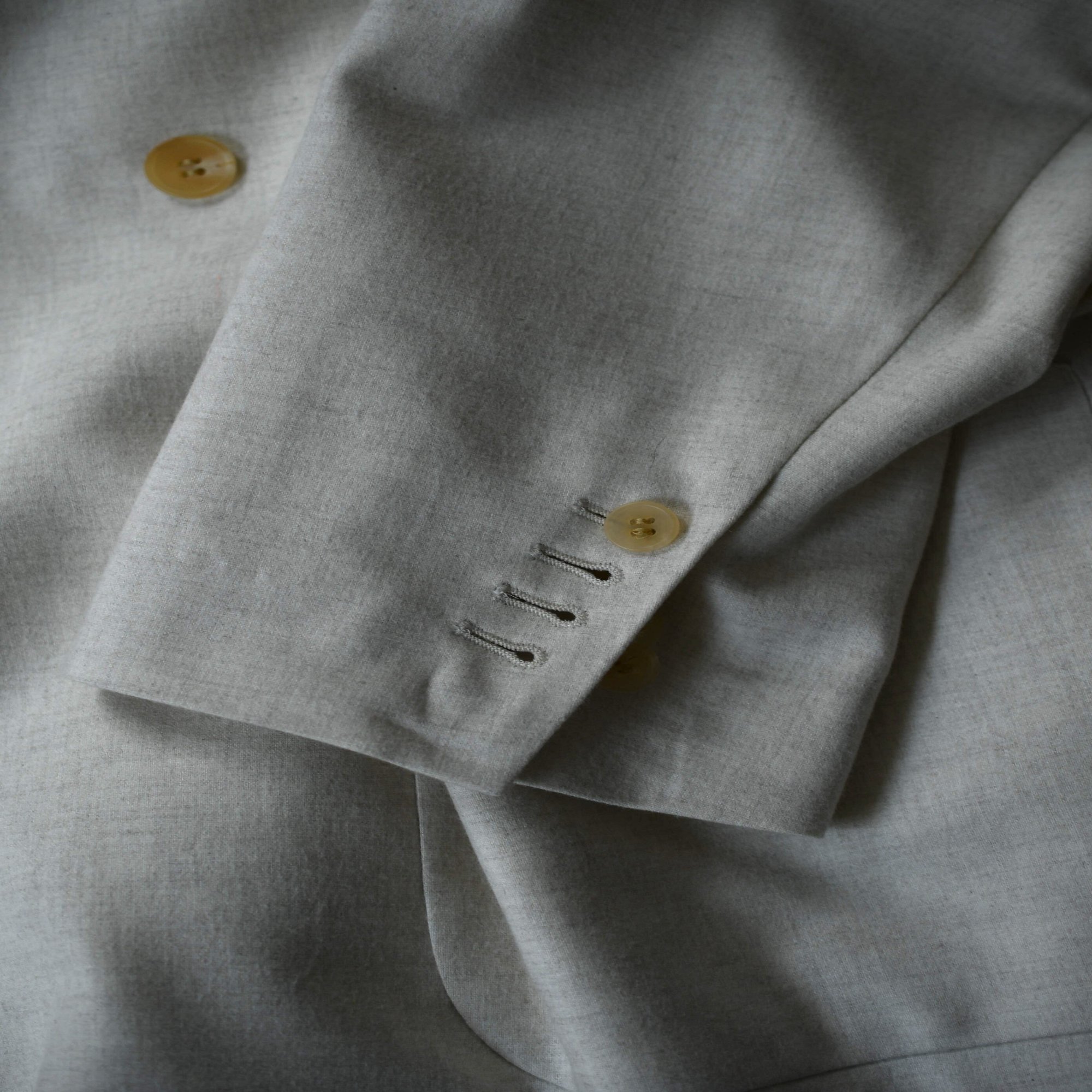 そんな確固たる拘りが注がれている中、このジャケットに用いられているウールとブルーフォックス混合の生地は、反自体が極小量で数着しか生産が出来無いという“リミテッドモデル”に該当する。やはりその分、生地のポテンシャルは本当に素晴らしく、タッチ感は非常に滑らかで、限りなくカシミアに近い。そして異なる無垢の糸が混合している為に薄らと奥行きがあり優しい表情を醸し出している。この温い質感とカラーパレットが根本として存在しているからこそ、本来は苦手に思えてしまう空気感が急に落ち着いて見え、モダンな『着れる』1着に一変されているのだと思う。
